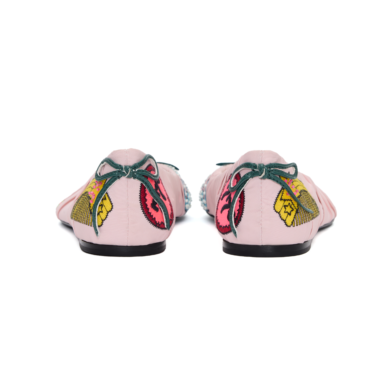 The upper part of the shoes is made of Japanese nylon fabric, while the sole is made of cowhide. It is decorated with embroidery patterns and there are leather bow knots on both the front and the back of the shoes.